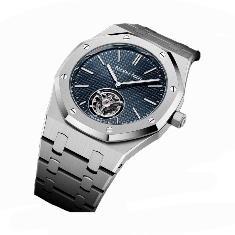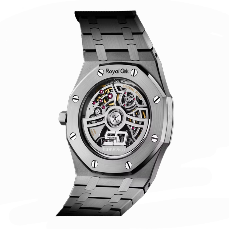 - نشانگرهای ساعت از طلای سفید و عقربههای Royal Oak با روکش شبتاب