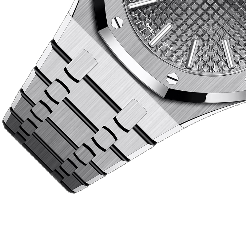 - شاخصهای ساعت از جنس طلای سفید و عقربههای رویال اُک با پوشش شب نما