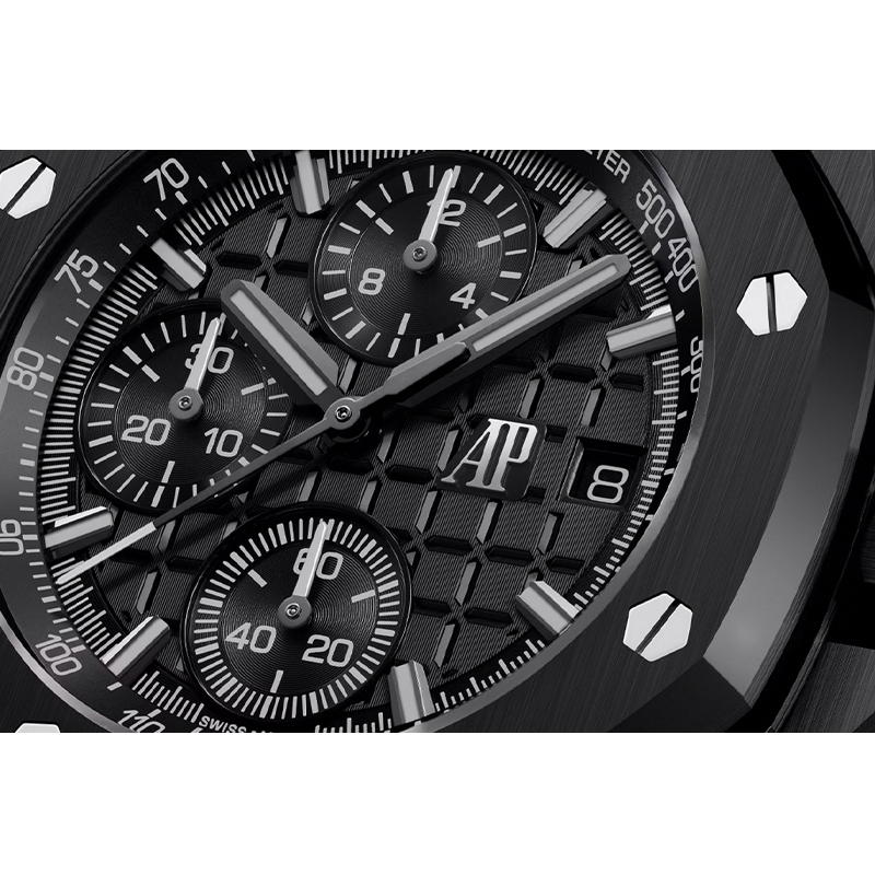 - نشانگرهای ساعتی و عقربههای طلای سفید 18 عیار مشکیشده