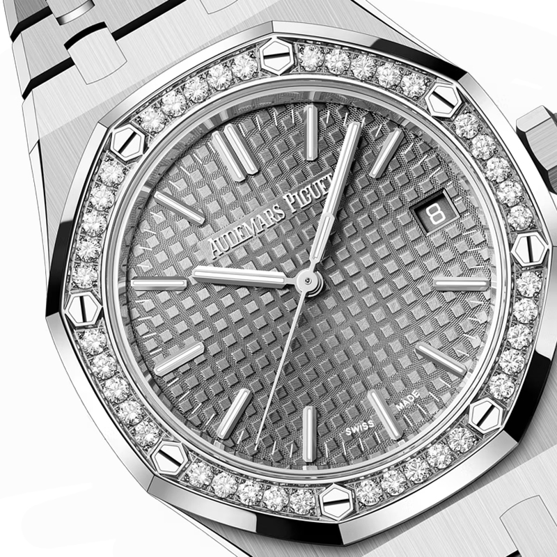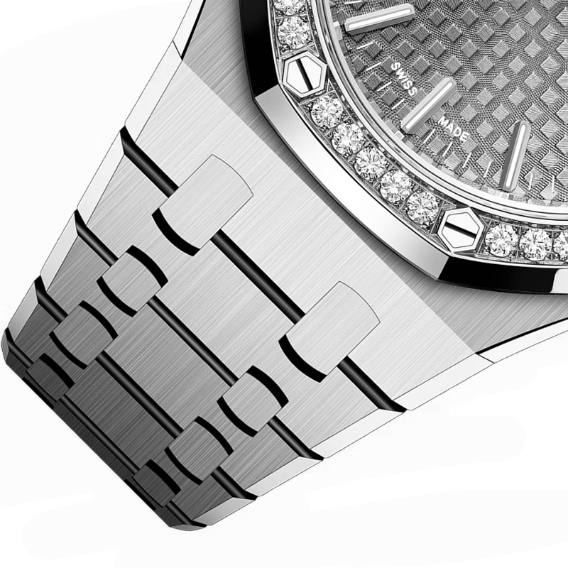- نشانگرهای ساعت از جنس طلای سفید و عقربههای Royal Oak با روکش شبتاب
